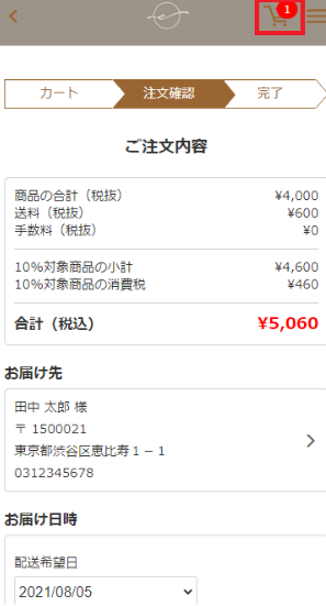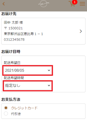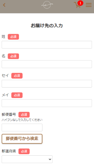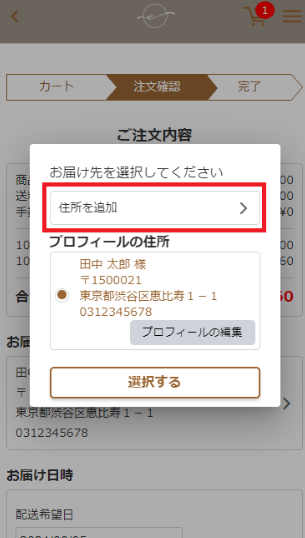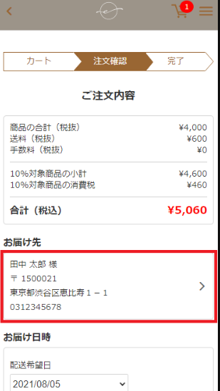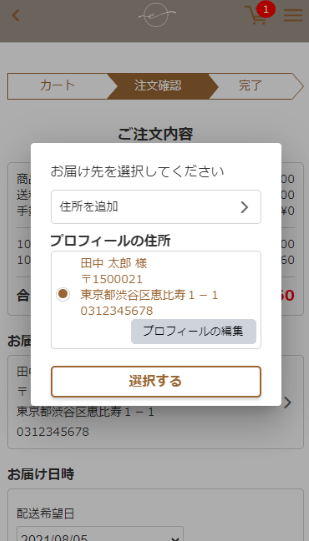 - 初期値として、プロフィールにご入力頂いた「お名前」「ご住所」「電話番号」が表示されます。