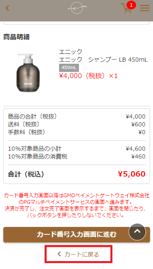 方法①画面下部の「カートに戻る」ボタンを押します。
