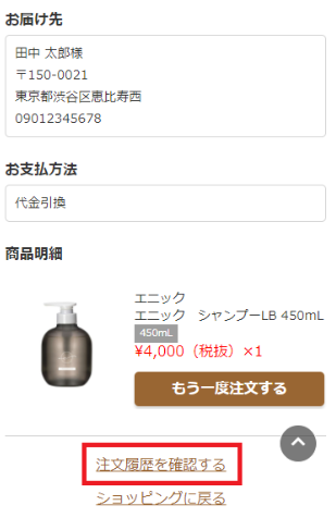 注文完了画面の「注文履歴を確認する」ボタンを押します。